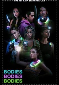 Während draußen ein heftiger Hurrikan tobt, feiern sieben Freund*innen im luxuriösen Anwesen der verreisten Eltern von David (Pete Davidson) eine Party. Dabei steht auch eine Partie „Bodies Bodies Bodies“ auf dem Programm: In dem an „Werwolf“ oder „Mafia“ erinnernden Gesellschaftsspiel wird zufällig einer der Mitspielenden als Mörder*in bestimmt – und muss dann, sobald das Licht gelöscht ist, andere durch einfaches tippen auf den Rücken „ermorden“. Nach jeder Runde müssen sich die Überlebenden auf einen möglichen Täter oder eine mögliche Täterin einigen – und wenn sie falsch liegen, wird das Licht wieder ausgeschaltet. Doch dann liegt David plötzlich mit durchtrennter Kehle auf der Veranda – offenbar nimmt einer der Mitspielenden die Sache doch etwas zu ernst. Und wie im titelgebenden Spiel müssen die Partygäste nun in der Realität enthüllen, wer dahintersteckt – denn sonst könnten sie selbst die nächsten Opfer sein…